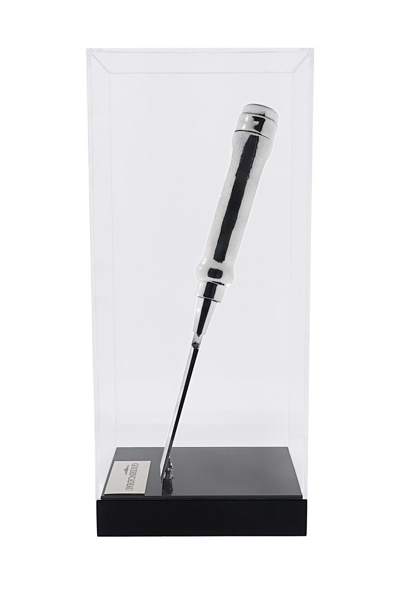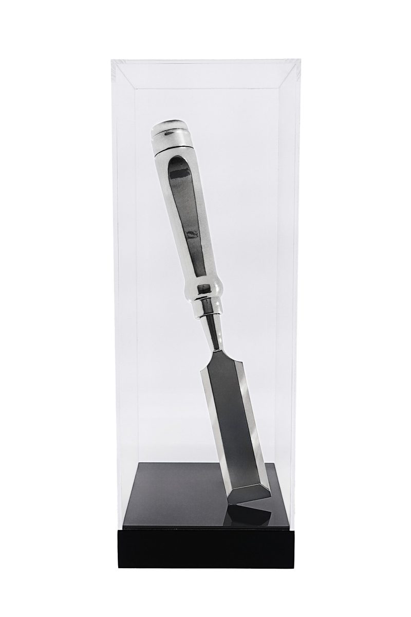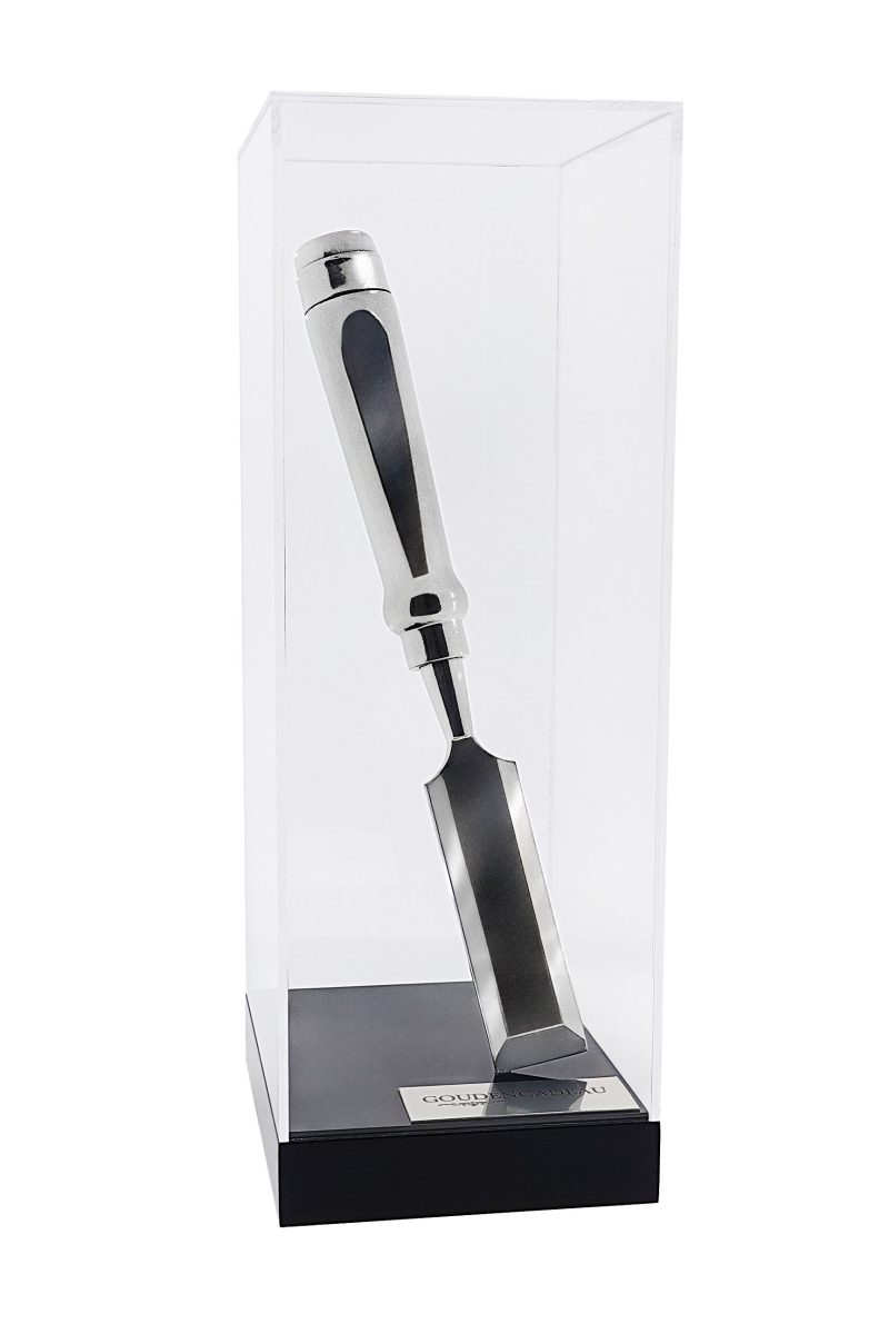 Zilveren beitel. De zilveren beitel kan als cadeau gegeven worden bij een jubileum, pensioen, afscheid of andere gelegenheid. De zilveren beitel is gemonteerd op een zwarte hoogglans gepolijste console. met plexiglas vitrine kap. Het is mogelijk een tekstplaatje te laten graveren met een persoonlijke boodschap. Een prachtig aandenken aan een mooie tijd.