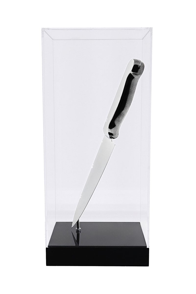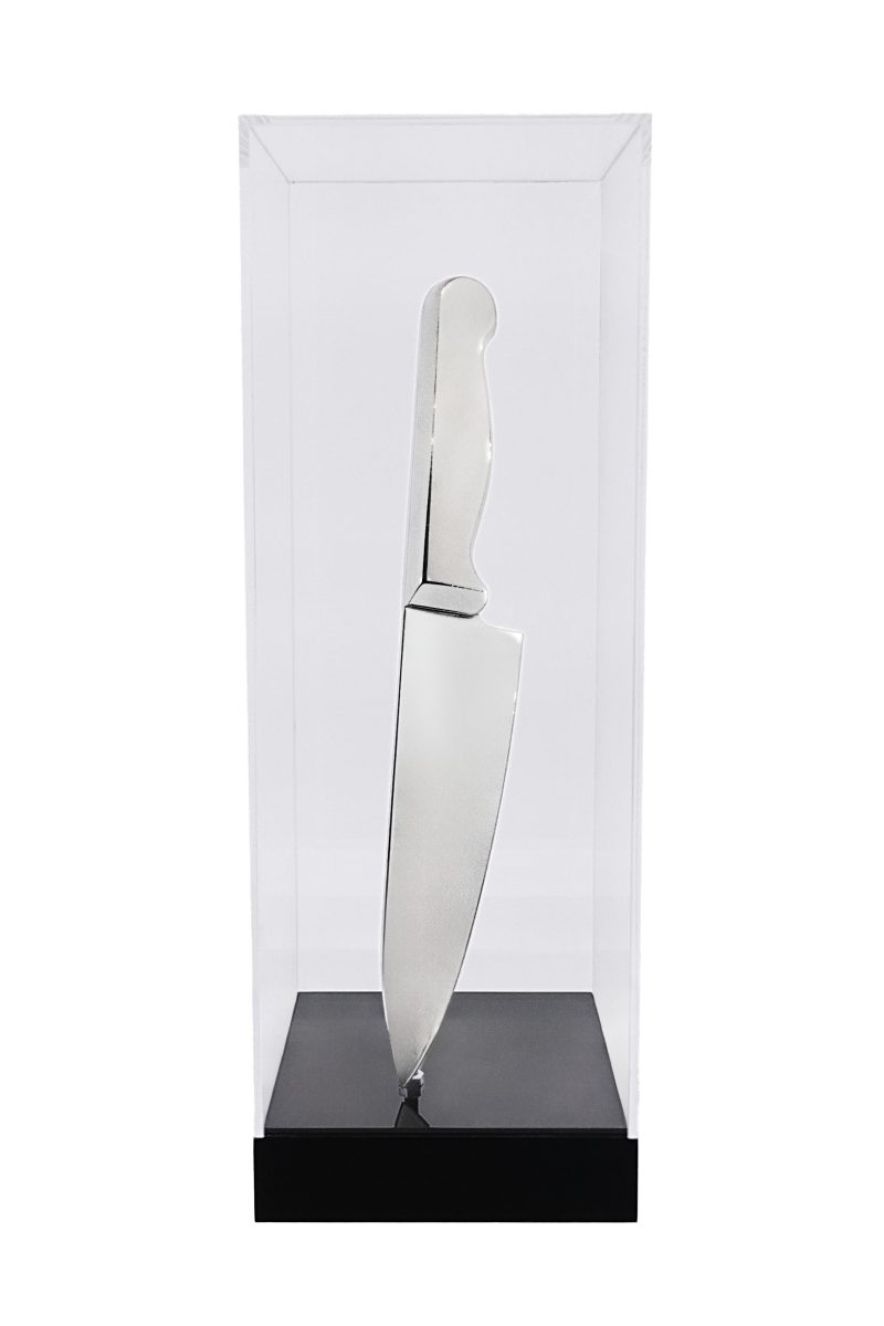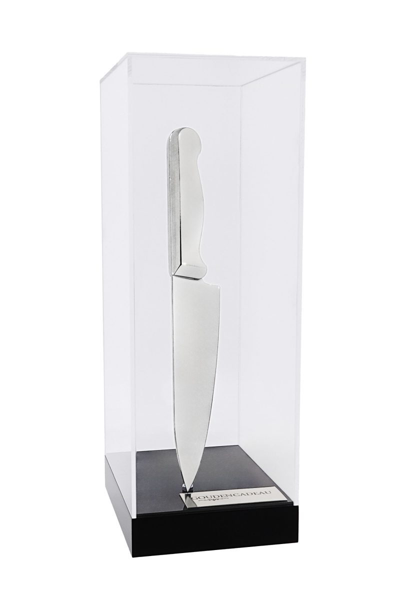 Zilveren koksmes. Het zilveren koksmes kan als cadeau gegeven worden bij een jubileum, pensioen, afscheid of andere gelegenheid. Het zilverenĀ koksmes is gemonteerd op een hoogglans zwarte console met plexiglas helder kap. Het is mogelijk een tekstplaatje te laten graveren met een persoonlijke boodschap. Een prachtig aandenken aan een mooie tijd.